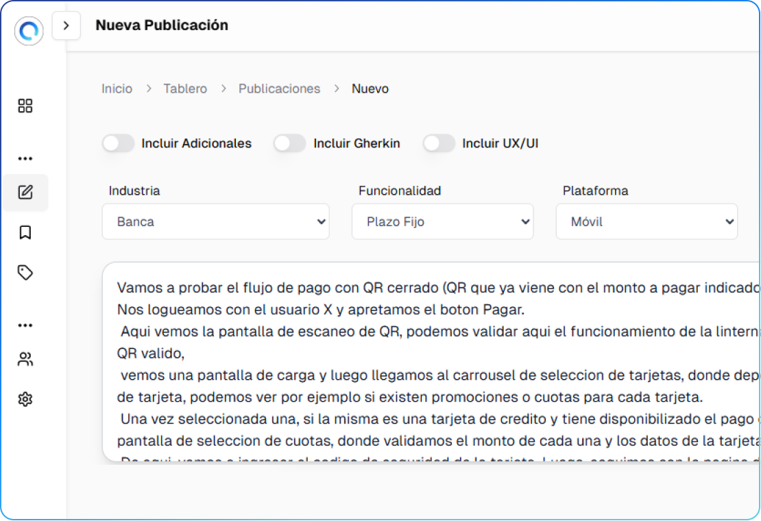 Genera automáticamente casos de prueba de alta calidad a partir de tus diseños. Velocidad, Cobertura y Precisión con Inteligencia Artificial.